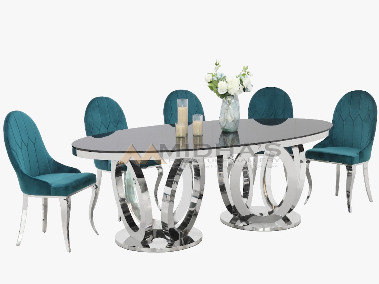 - A glamorous glass dining table set that will add a charming effect to your dining room. It has oval shape and black tempered glass top to enhance the overall glam effect. The designer base looks unique and add and alluring effect. You can match similar looking chairs or add contrasting feature by going with bold and bright coloured chairs for visual interest. An ideal choice of dining table for hyping up your dining area.