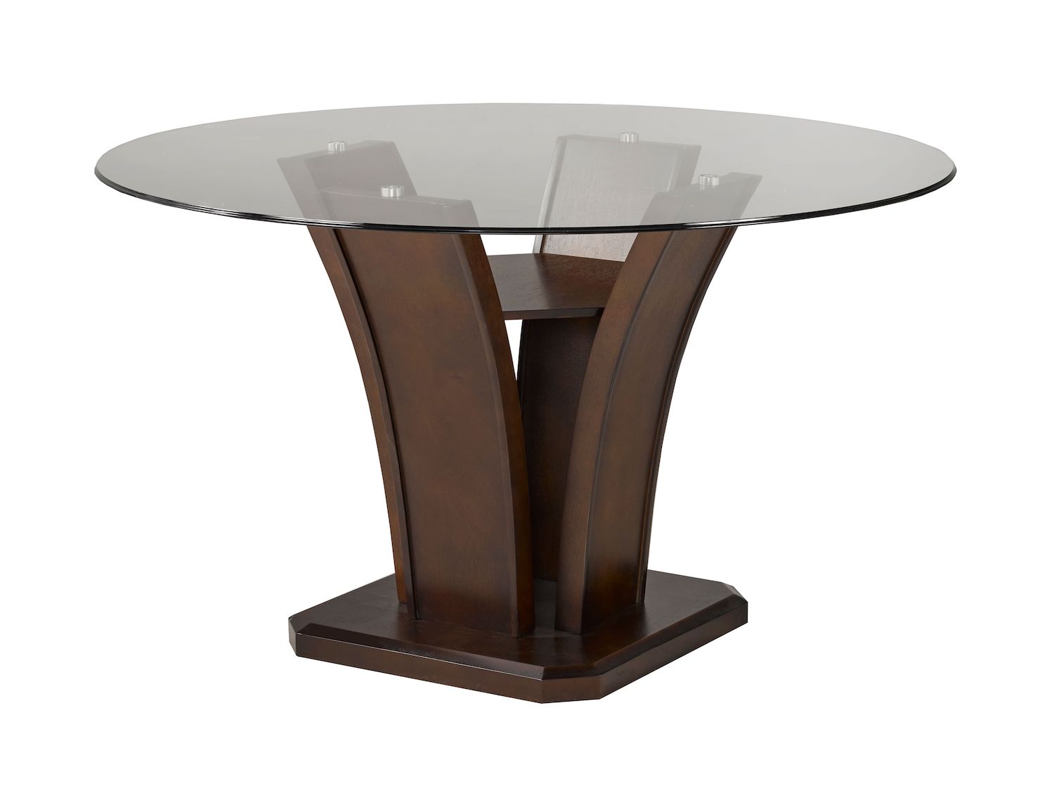 - Style and substance collide beautifully with this chic dining table. An archly toned espresso wood base that gives the illusion of height and supports a tempered glass tabletop. Elliptical lines keep the look clean and refined, while the contrasting elements lend subtle brilliance to your living space.