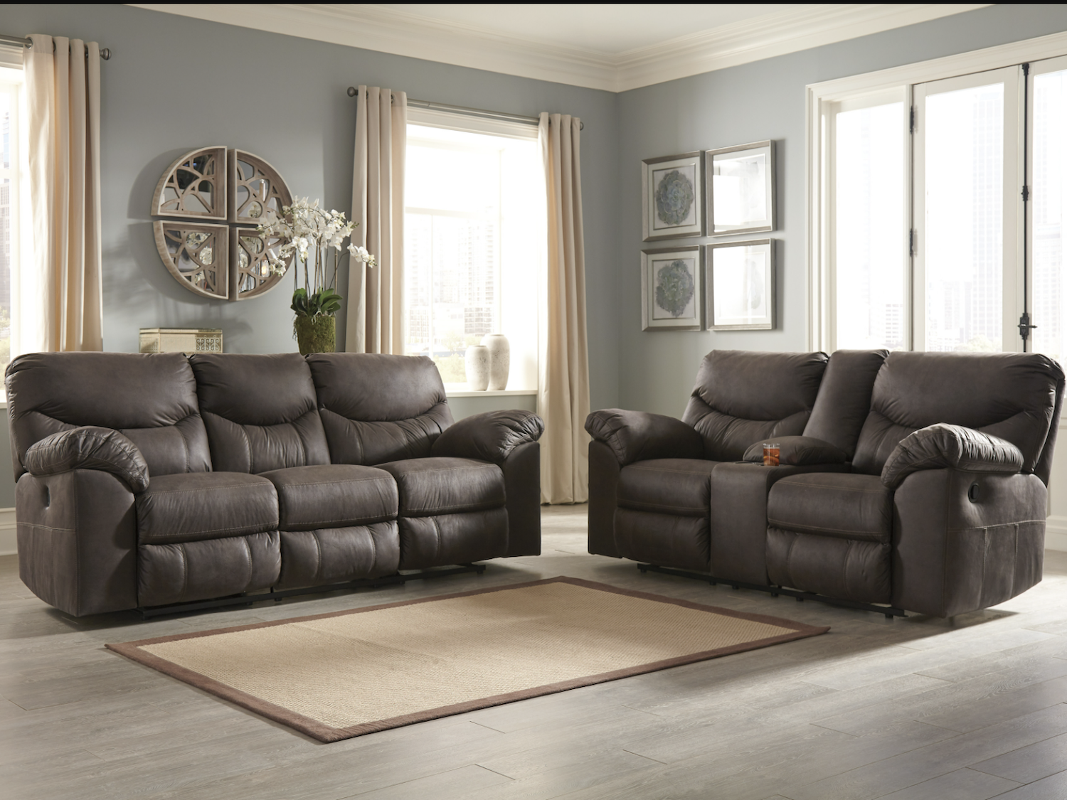 - Ashley Boxberg Dual-sided Recliner Sofa in Bark Colour. Rock the cool look of leather minus the hefty price tag with this reclining sofa. Rich with tonal variation, the indulgently soft upholstery sure looks like the real thing. And talk about indulgent comfort. Double stuffed armrests and sumptuous cushions cradle and support in all the right places. Distinctive scooped stitching enhances this reclining sofa’s contemporary flair.