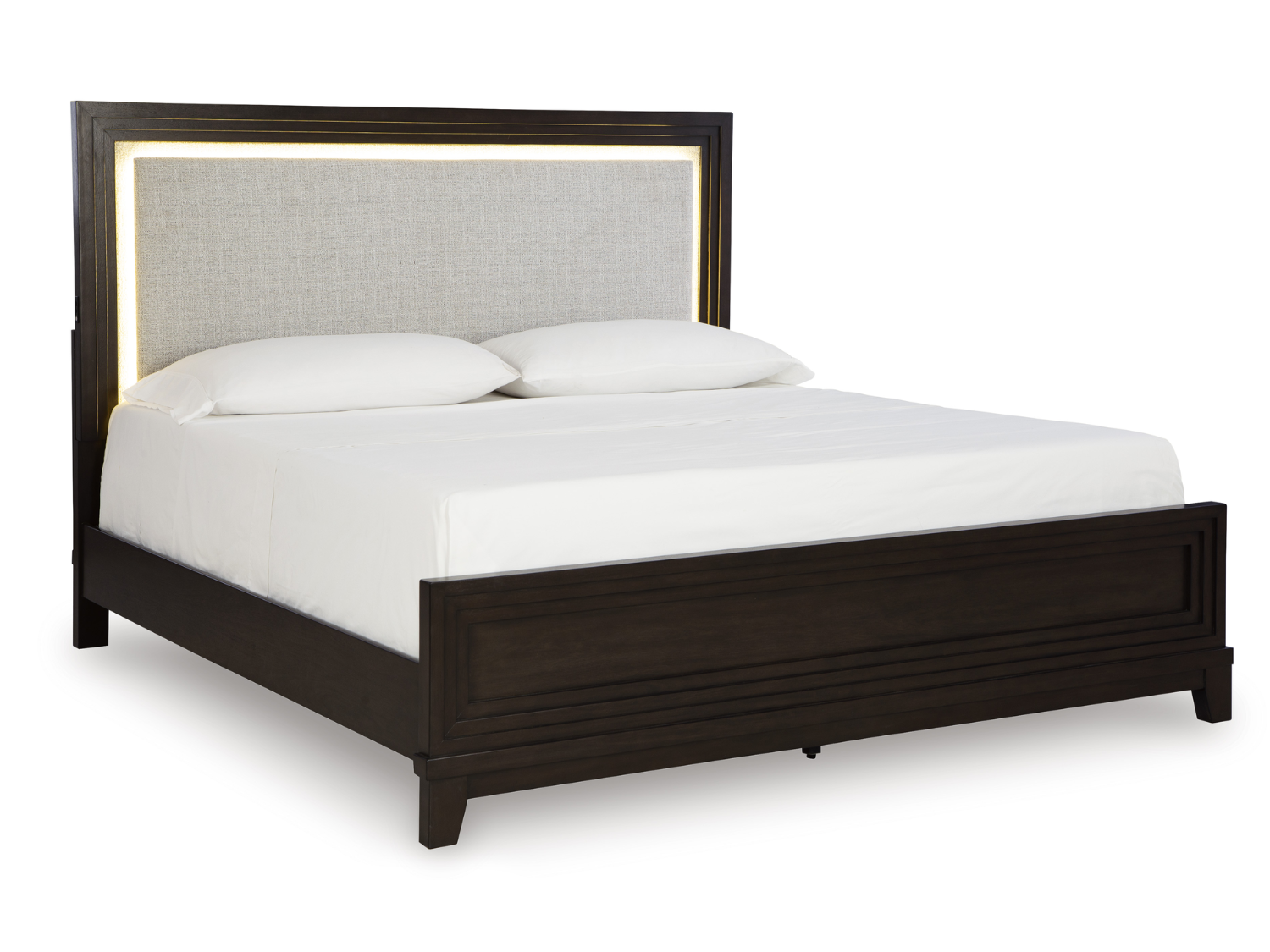 - Combining modern and art deco styles, this queen upholstered panel bed completes your sanctuary with fashionable functionality. LED backlighting steals the show, highlighting a headboard with all the upgrades you desire—including USB charging and easy-to-clean Nuvella® performance fabric. Indulge in a fresh look that feels right at home.