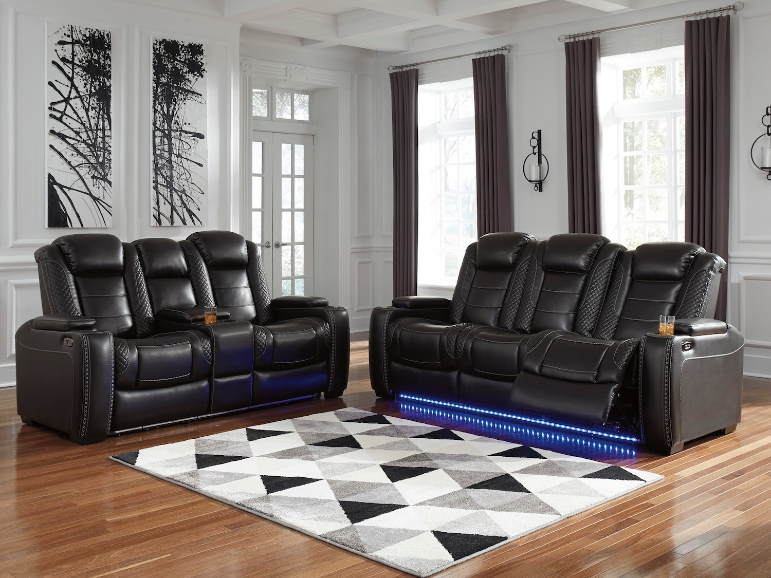 - Ashley Party Time Power Reclining Sofa Includes USB Charging with LED Lighted Cup Holder. This power reclining sofa takes its cue from luxury automobiles with lattice and crosshatch stitching, for a richly tailored aesthetic that gives you plenty of reasons to celebrate. Sumptuously padded cushions and crisp white faux leather upholstery add to the indulgence. When it’s time to rev up the action, the dual reclining bucket seats (middle seat stays stationary), Easy View™ power adjustable headrests, LED accent lighting, and center seat that folds down into a table keep you in the driver’s seat.