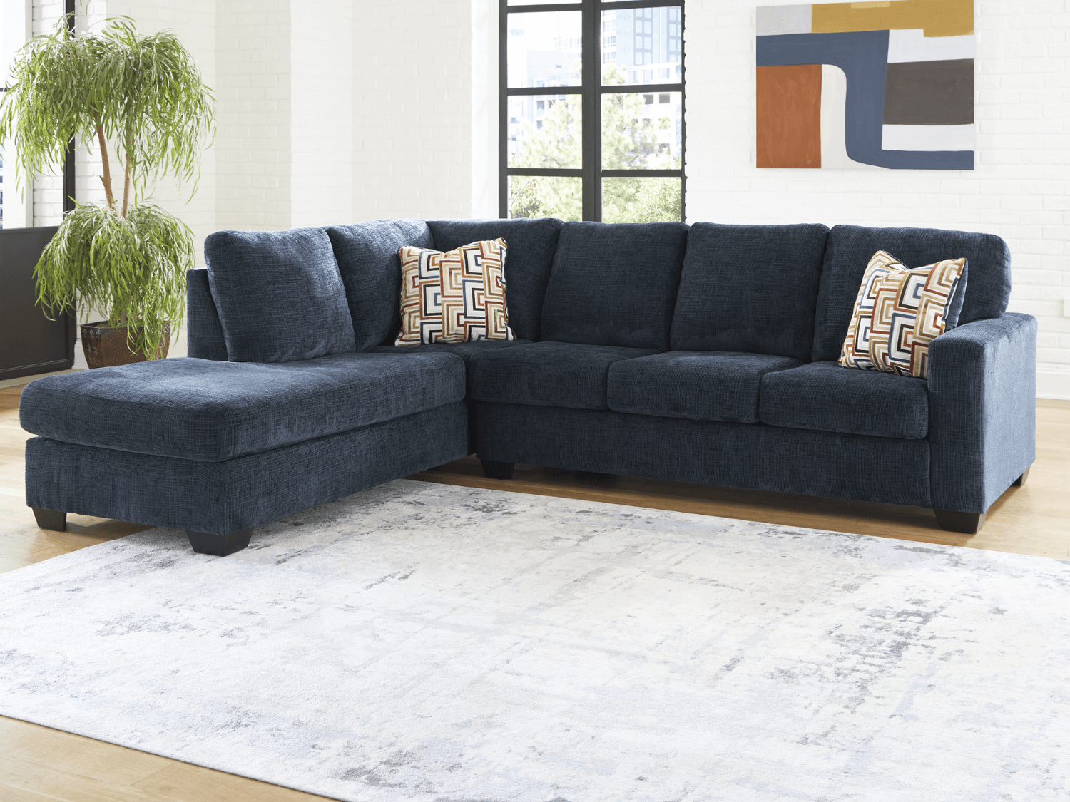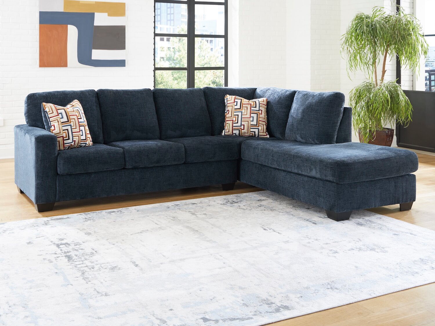 - Looking to make a bold statement with color? Liven up your living room with this sectional with chaise. Its trend-right navy blue upholstery adds a playful pop of color to your decor. Bold and eclectic accent pillows complete the look. Pairing posh style with everyday comfort, the sectional is a welcome addition to contemporary spaces. The platform foundation system resists sagging 3x better than the spring system after 20,000 testing cycles by providing more even support