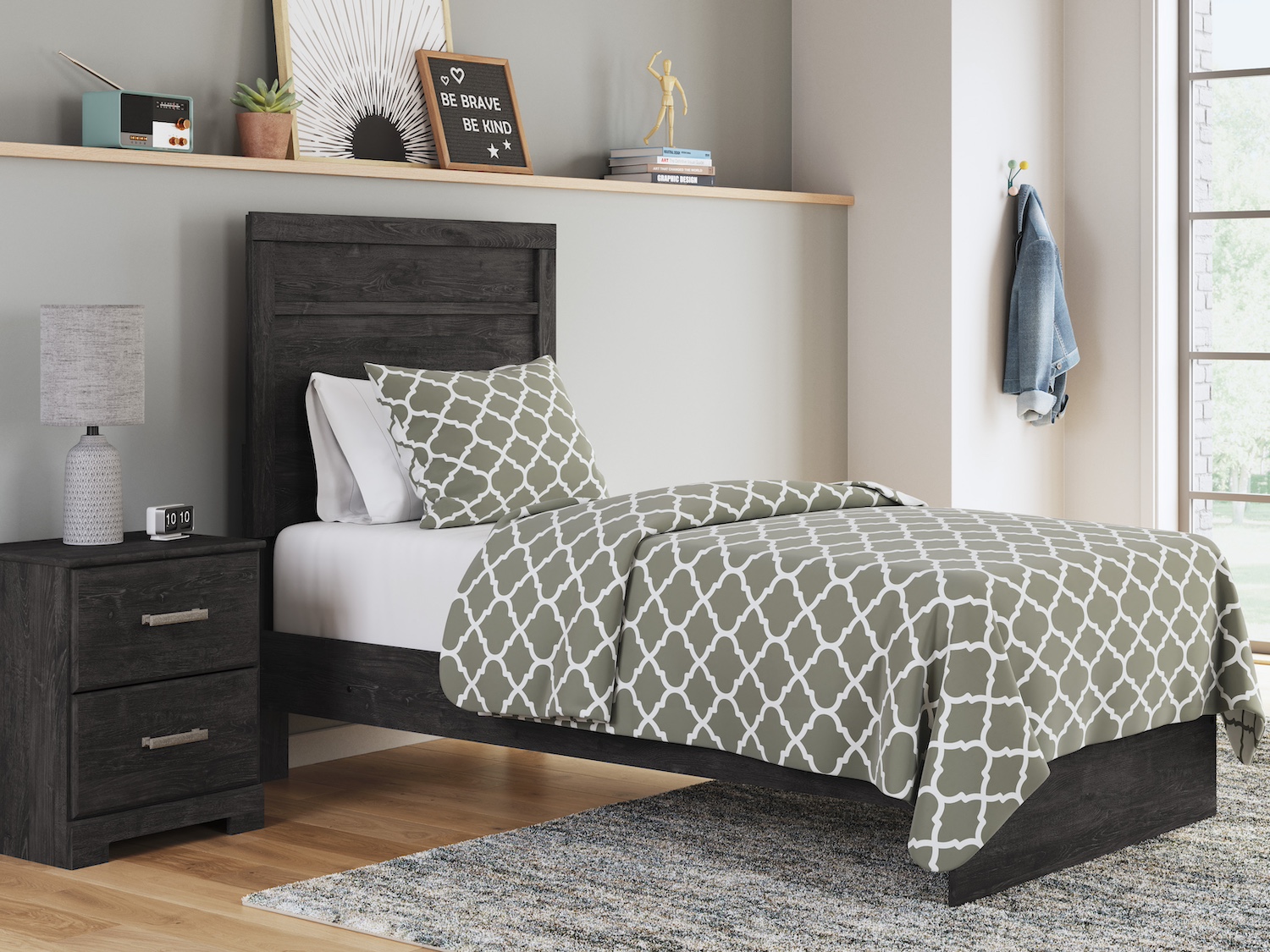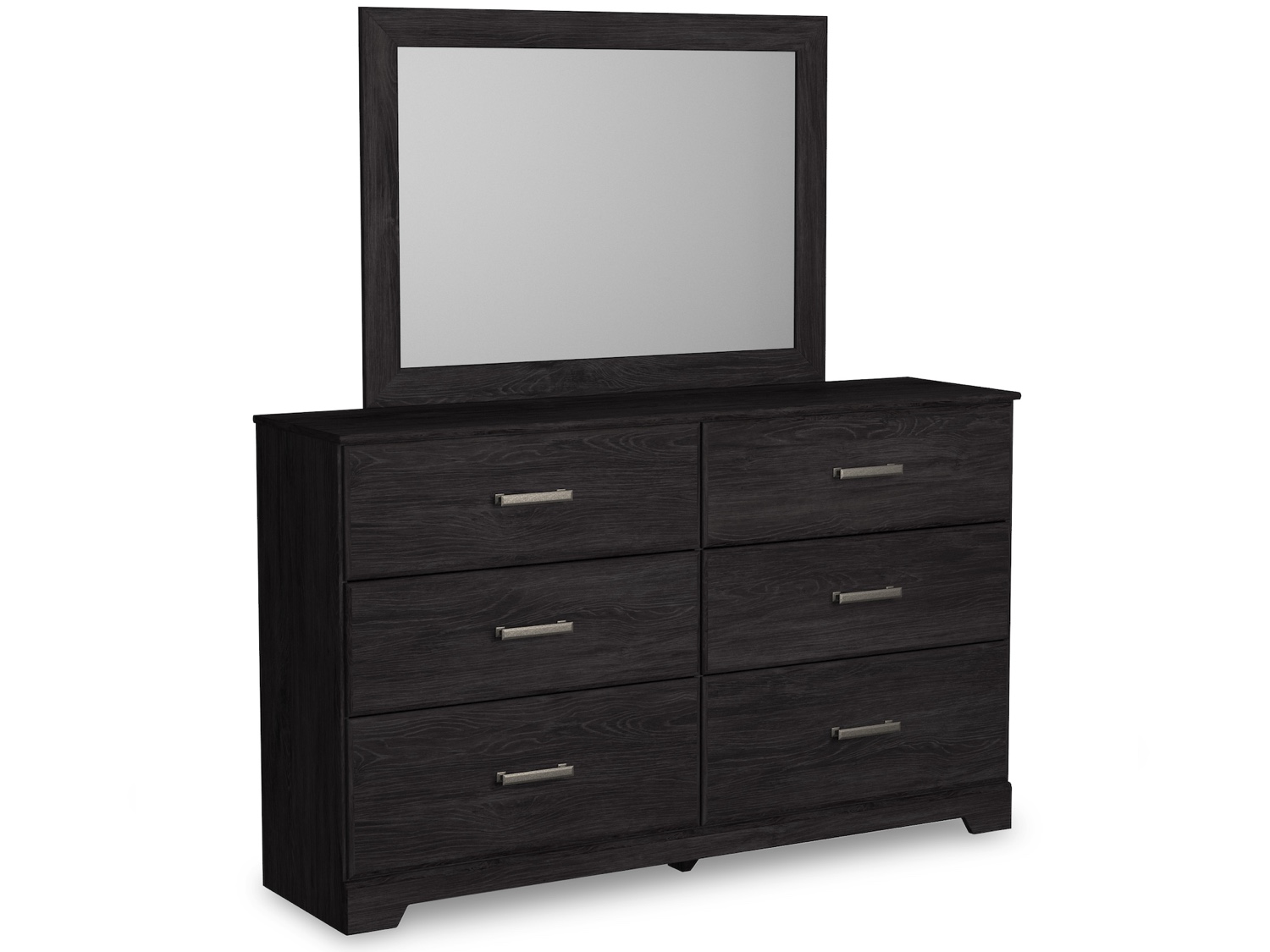 - With its clean-lined look and modern attitude, this bedroom package is a fresh style awakening. A warm charcoal hue over replicated oak grain easily complements other furniture finishes. Smooth drawer fronts with antiqued pewter-tone handles complete the aesthetic. Made with engineered wood (MDF/particleboard/plywood) and decorative laminate for the right balance of affordability and durability. Decorative laminate replicates natural or man-made material surfaces with consistent color, pattern and texture