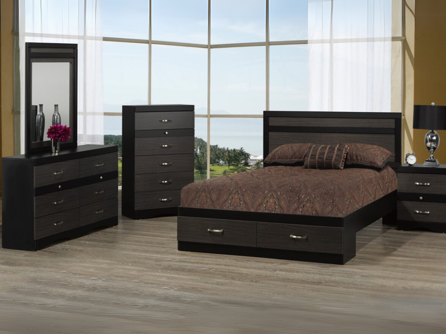 - Upgrade your bedroom with this stylish and practical 6-piece bedroom set. The set includes a Queen-sized bed with a headboard, storage footboard (featuring two spacious drawers), and rails, a dresser, a matching mirror, and a nightstand. Designed for elegance and functionality, this set is perfect for any modern bedroom. Available in Single, Double, Queen, and King sizes, it offers ample storage and a sleek black/tuxedo finish to enhance your space
