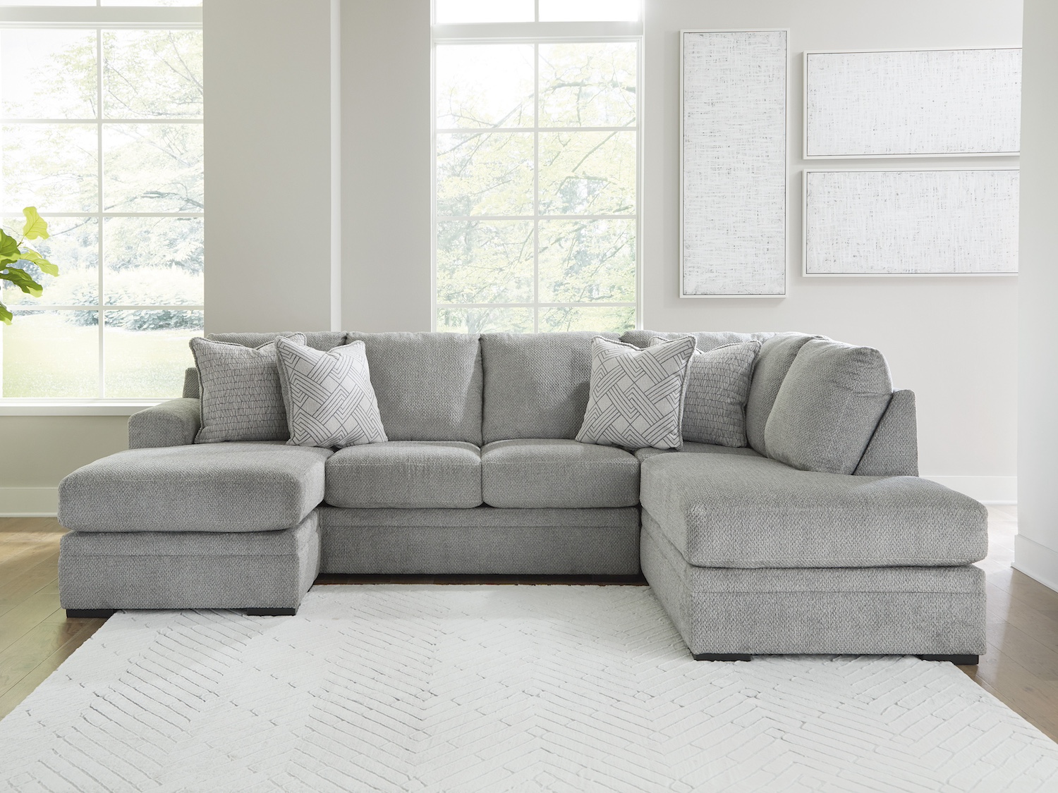 - Don’t be limited by a lack of space. This sectional makes family movie nights and get-togethers with friends all the more cozy. With its double-chaise configuration, everyone has a spot to lounge. A trendy gray hue offers the contemporary style you crave. So sit back and relax—this functional piece is ready to indulge you with everyday comfort.