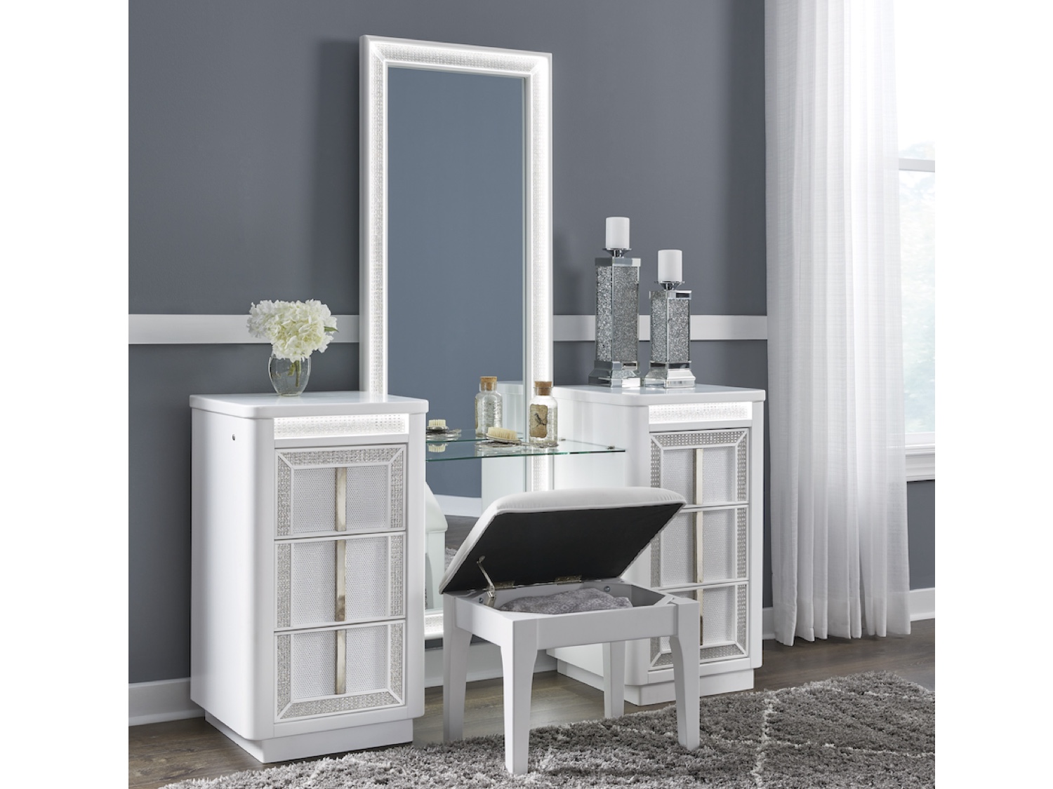 - Transform your bedroom with this chic vanity and mirror. Its modern design and glamorous details create a sophisticated retreat. The built-in LED lighting and rhinestone-framed drawers and mirror add style and practical storage while reflecting elegance. Let your sanctuary shine—and never let anyone dull your sparkle.