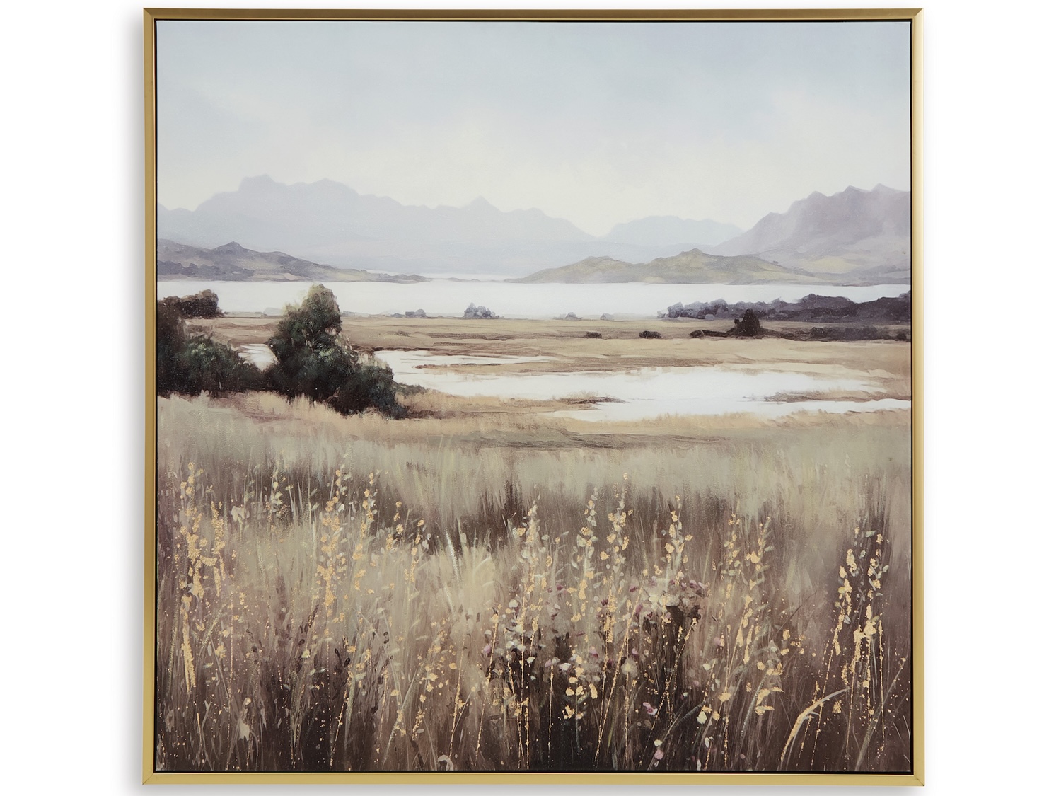 - This wall art puts a peaceful spin on hanging decor. Its quiet landscape invites you to a lakeside field, with rolling mountains in the background that bring depth to the design. Hand-painted and gold leaf embellishments make each piece unique.