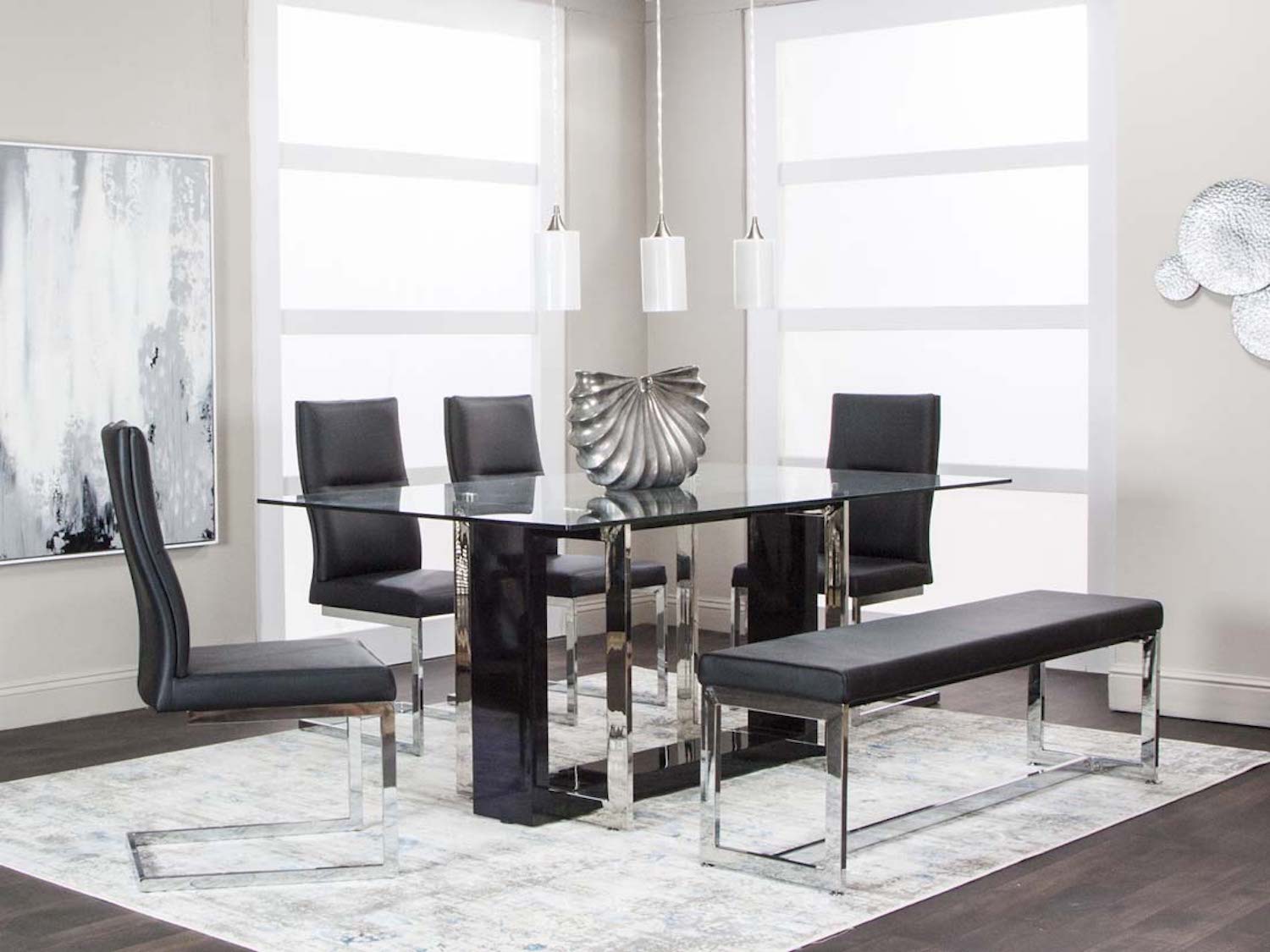 - Nothing speaks luxury like a black dining table with glass top. The tempered glass top ensures sturdiness and longevity of the dining table. It has designer high gloss black polyester table base with chrome framing to add interesting visual contrast. This black glass dining table comes with four chairs that have fully wielded top and base along with 100% polyurethane upholstery. A classy dining table set that is exclusively available in black colour giving it the uniqueness that makes it stand out. Reflective surface that will shine through every and any home you put it in.
