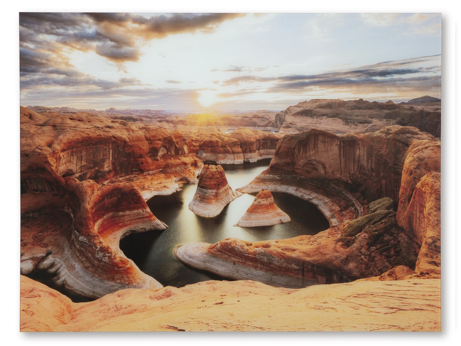 - Immerse yourself in the breathtaking beauty of this print on glass. Capturing the serene majesty of sunrise over intricate canyon rock formations and tranquil waters, it brings the awe-inspiring wonders of nature into your home. This stunning piece adds a sense of adventure and tranquility to your wall decor.