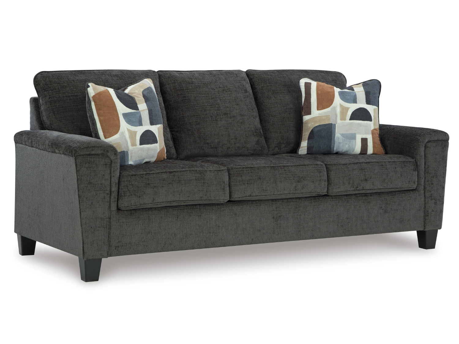 - There’s something about this sofa that’s so easy to appreciate. Maybe it’s the plush upholstery and soothing tone, eager to support your quest for total relaxation. Perhaps it's the modern flair of its simple lines, tapered legs and abstract-patterned pillows. Whatever it is that appeals to you, this is a piece you're gonna love.