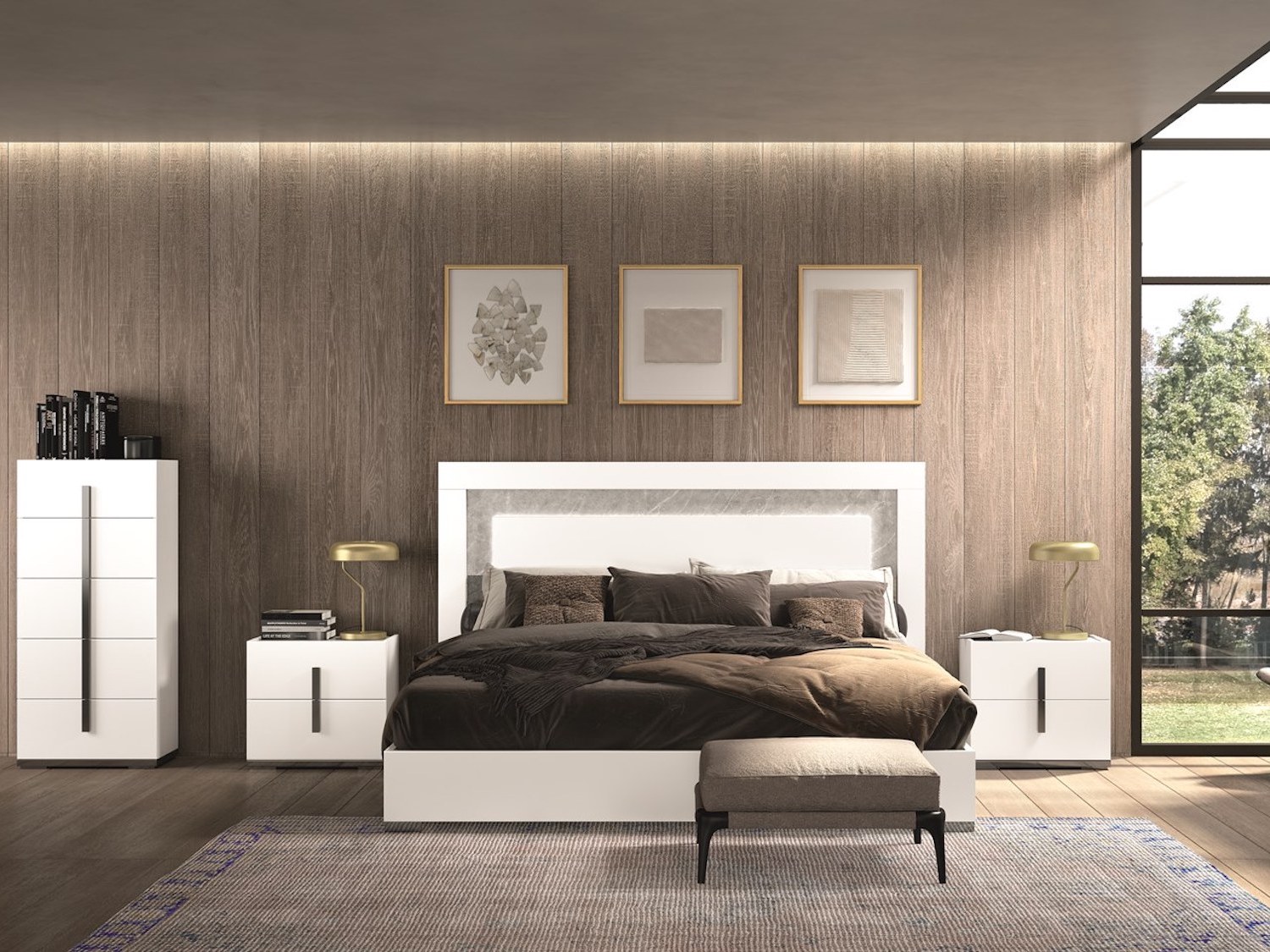 - Luxury modern bedroom furniture in white and grey marble setting the right tone for modern homes. The high gloss multi layered acrylic coating creates a stylish finish that will last a long time. When looking for bedroom set for sale Brampton know that this elegant piece will have the heads turning in admiration. The burnished chrome metal finish on handles creates the perfect contrast and visual interest. The drawer and door mechanism is slow and soft closing with the legs having ABS burnished chrome finish. A beautiful bed set with sleek and clean cut look in peaceful white colour to give the perfect bedroom vibes.