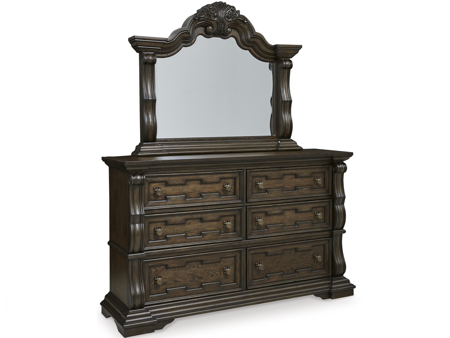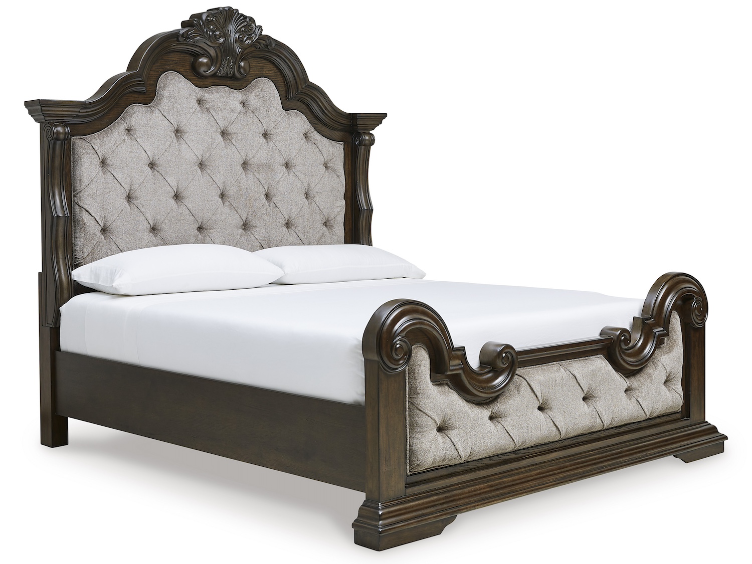- Opulent Traditional styling. Inspired by the grandeur and grace of Old World traditional style, this bedroom collection is nothing short of stunning. A choice blend of materials is accented by detailed ornamental appliques and large-scale decorative scrolled pilasters make a grand stance. Made with hardwood solids, oak and ash swirl veneers with MDF substrates and cast resin components. Finished in a dark brown coloration. Bed features sculptural ornate details upholstered headboard and footboard is covered in a button tufted softly textured chenille in a pewter color. Top of cases include an ash swirl border and dark walnut inlay. Accented with antique gold toned drawer pulls. Three drawer night stand features a concealed drawer for keeping valuables out of sight and includes a 110V power supply with dual USB charging ports.