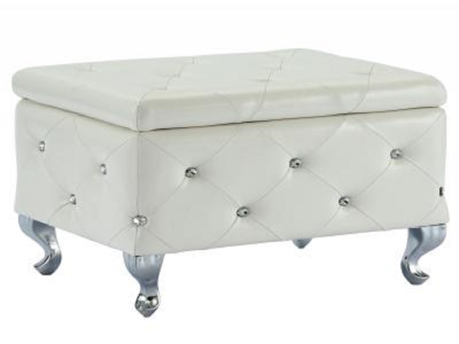 - Monique Single Storage Ottoman in White Faux Leather. A storage ottoman can be a lavish touch to any home decor ensemble, but this ottoman is truly a one of a kind statement piece. With magnificent blush velvet upholstery, a beautiful, diamond-patterned stitching detail, and sparkling crystal button tufting, you'll think this piece came straight off of a fashion runway. Add to it the cabriole style legs with a chrome finish and this ottoman is sure to dazzle from any angle. Attention to detail is in all of the finishes as it includes a deep multi-purpose storage compartment and safety stop hinges to ensure that closing this ottoman will feel as soft and luxurious as it looks. Whether using it for storage or plush seating, this ottoman is sure to turn any ordinary room into something palatial. Perfect for the end of a bed to add some bling to your bedroom. Or place a clear tray on top and use as an elegant coffee table.