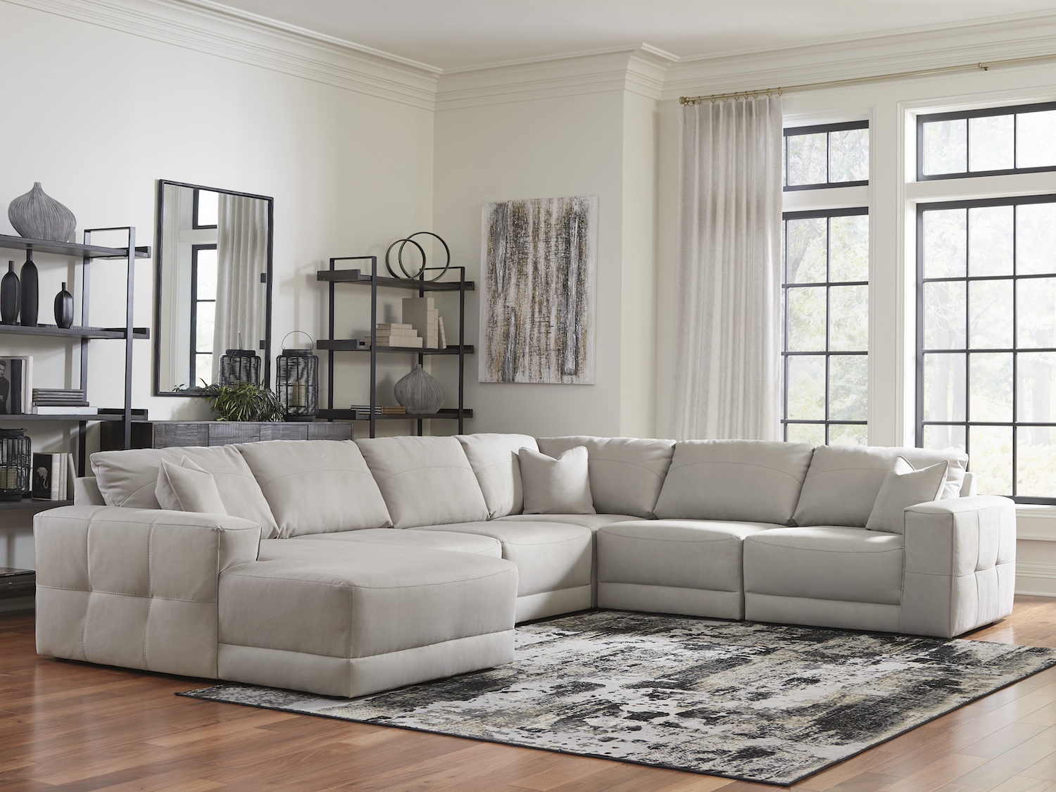 - The expansive silhouette of this sectional invites you to spread out and relax. Upholstered in a durable gray faux leather that captures the look and feel of nubuck leather, this stunning piece envelops you in baby-soft comfort. Its clean modern aesthetic is designed to age gracefully and leave a lasting impression. And the sectional's modular design lets you stage the pieces solo or rearrange them for a look that's always fresh.