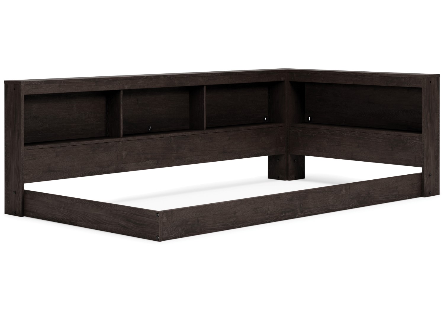 - This twin bookcase storage bed is an inspired find, beautifully blending simple and contemporary style. Its dark charcoal finish over replicated oak grain with an authentic touch keeps things simple, while the bookshelf storage creates added function. This charming storage bed also offers slim-profile dual USB chargers and requires no additional foundation.