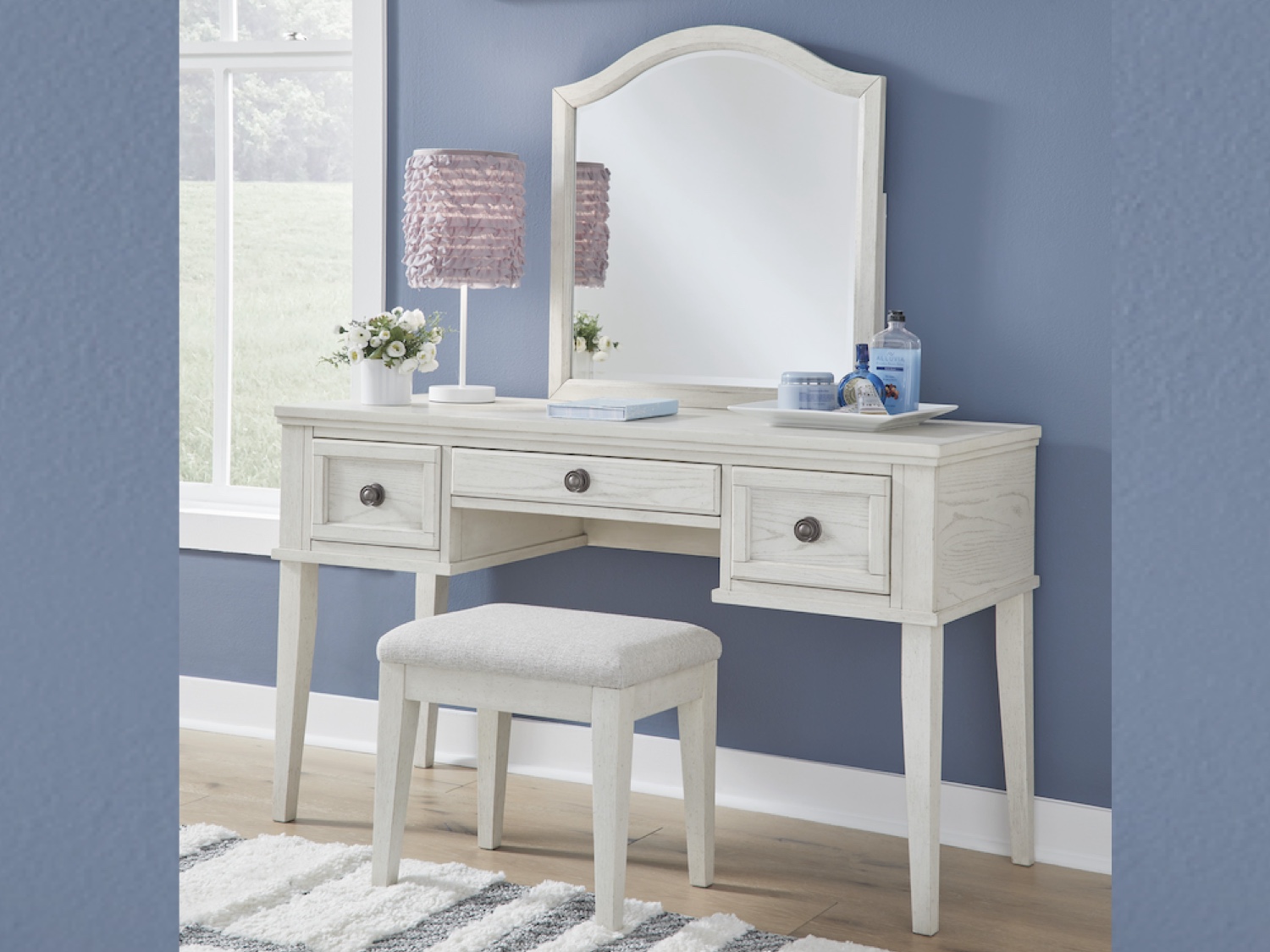 - Elegant, timeless furnishings take your bedroom to the next level. Nothing does that better than this mirrored vanity with bench. The antiqued white finish with a wonderful grain texture radiates sophistication, while dark bronze-tone knobs add an ornate touch. Three storage drawers and a soft cushioned seat round out this tasteful set.