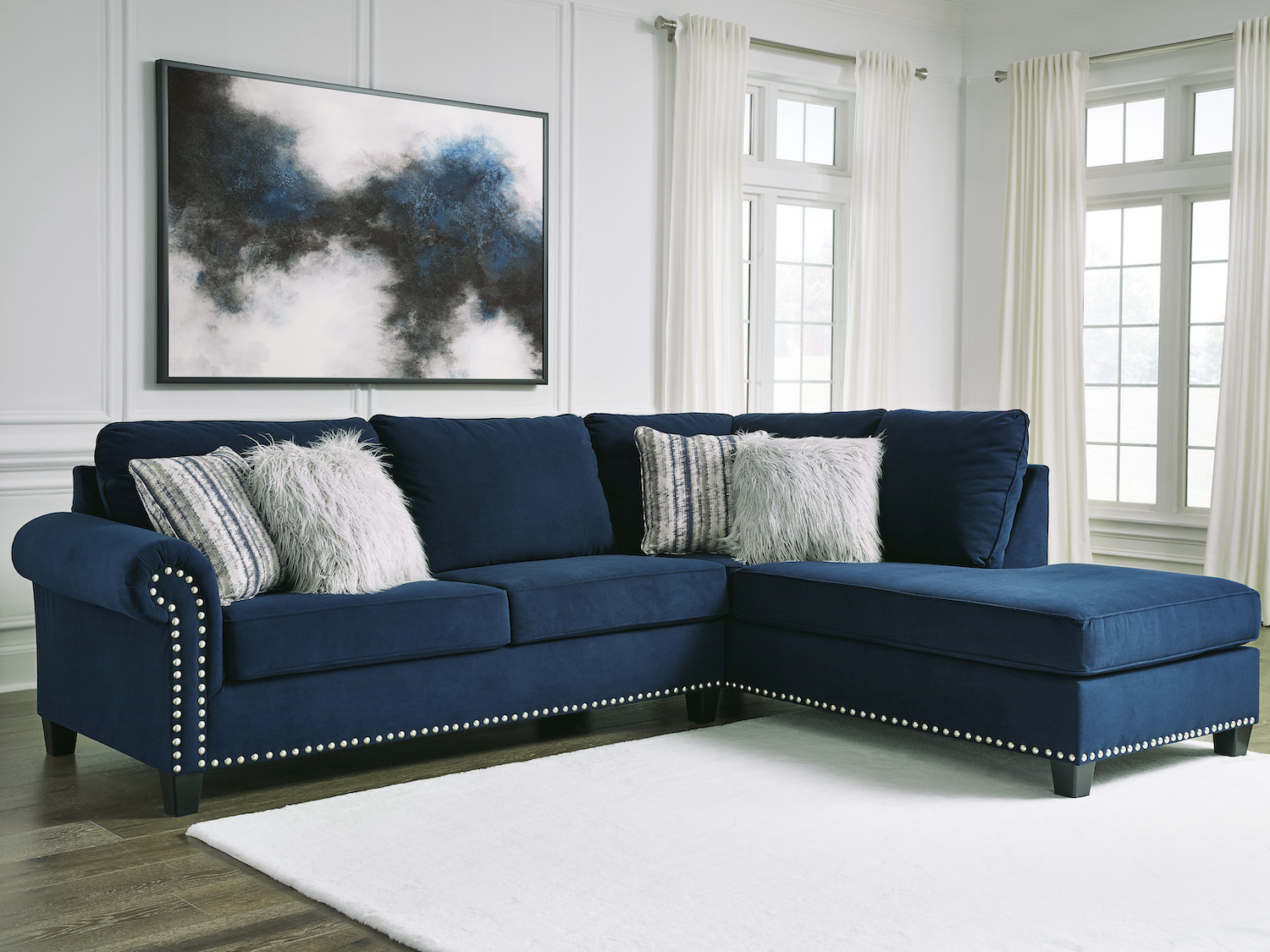 - There are two sides to this sectional. The traditional side includes roll arms, an elegant, timeless profile and sophisticated tailoring. Then there are the modern comforts: exceptionally plush cushions and a decadent chaise, giving your guests plenty of seating and giving you all the sack-out space you deserve. The stunning velvet upholstery is punctuated with distinctive nailhead trim. Faux fur pillows add the perfect touch of glam. Platform foundation system resists sagging 3x better than spring system after 20,000 testing cycles by providing more even support
