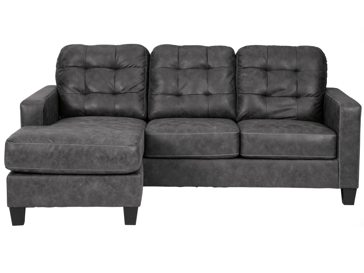 - This ultra-contemporary sofa chaise invites you to spread out and make yourself comfortable. Linear track arms offer a clean, sleek aesthetic, while tufted box cushions are a nod to mid-century design. Rest assured, a movable ottoman and reversible seat cushions allow you to place the chaise on either side for the perfect fit. Gunmetal gray faux leather offers the cool, weathered look you love and touchably soft feel you crave. Platform foundation system resists sagging 3x better than spring system after 20,000 testing cycles by providing more even support. Smooth platform foundation maintains tight, wrinkle-free look without dips or sags that can occur over time with sinuous spring foundations