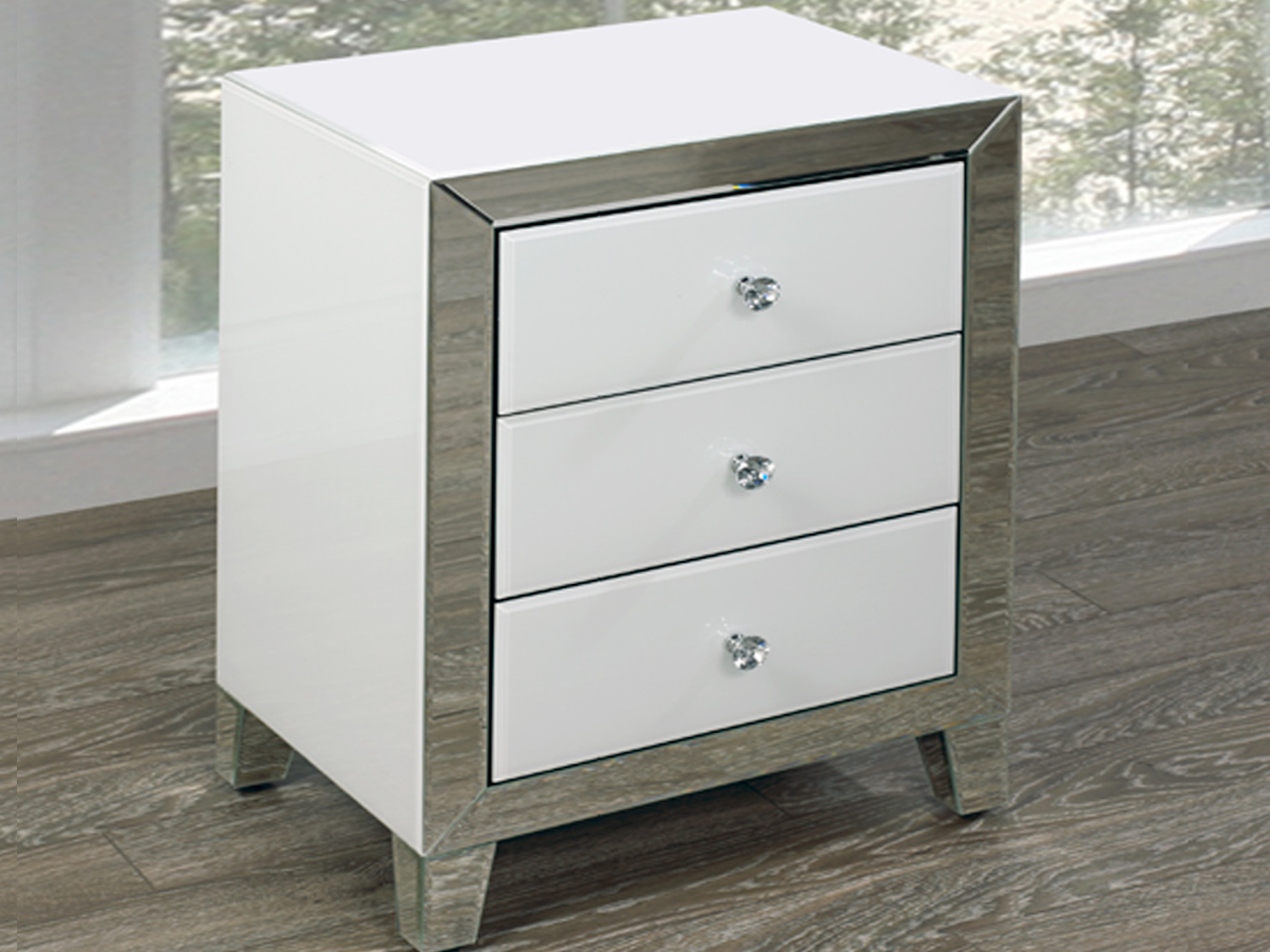 - A must have bedside stand table perfect to blend with modern and contemporary homes. It has mirror finish with beautiful wooden framing that adds a bit of drama and contrasting feature. The framing is done with wood so sturdiness is insured. The three drawers provides ample of storage space to keep your night stand accessories tucked away in a clean and neat way.